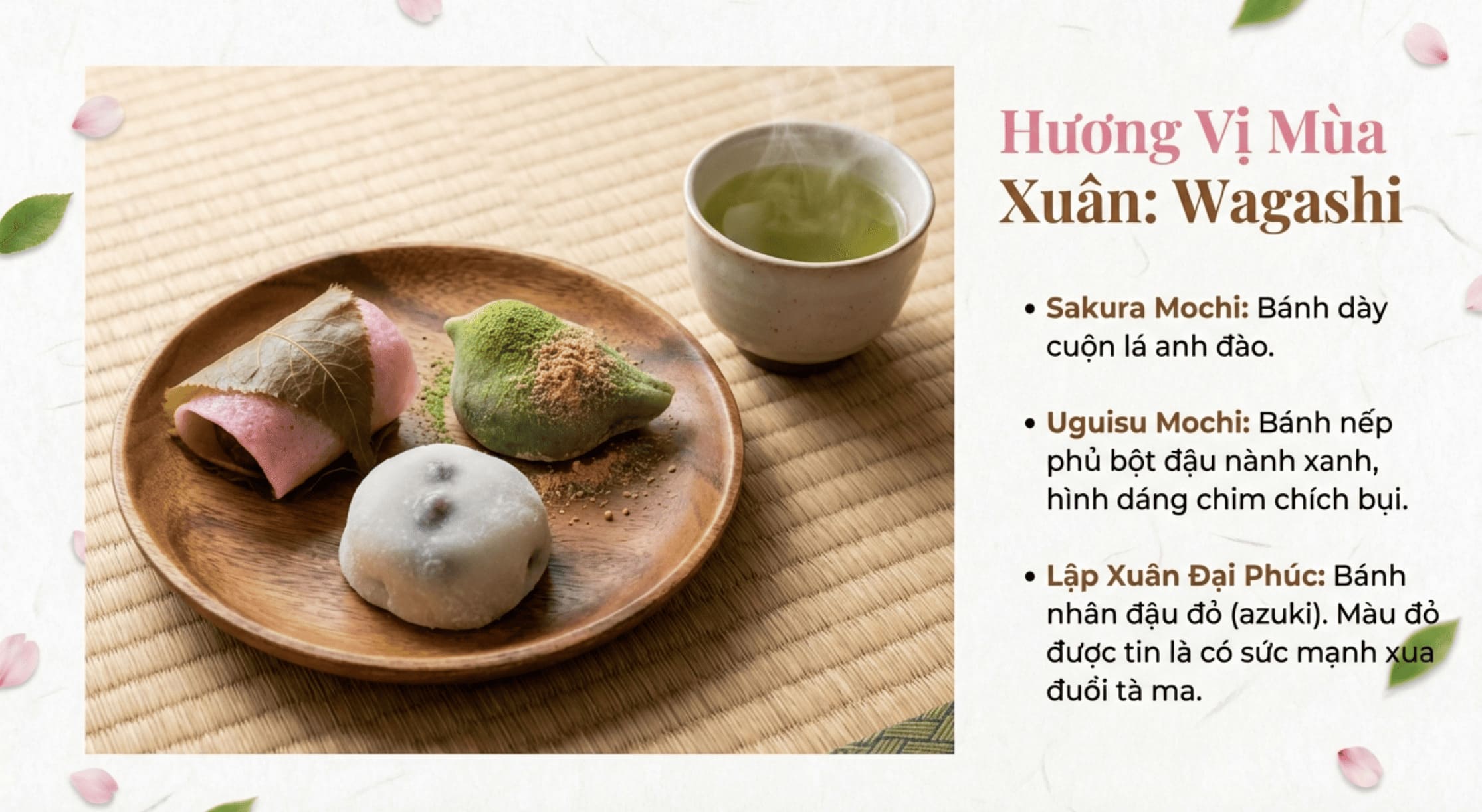 Vào dịp này, mọi người thường thưởng thức các loại bánh Wagashi mang hương vị mùa xuân.